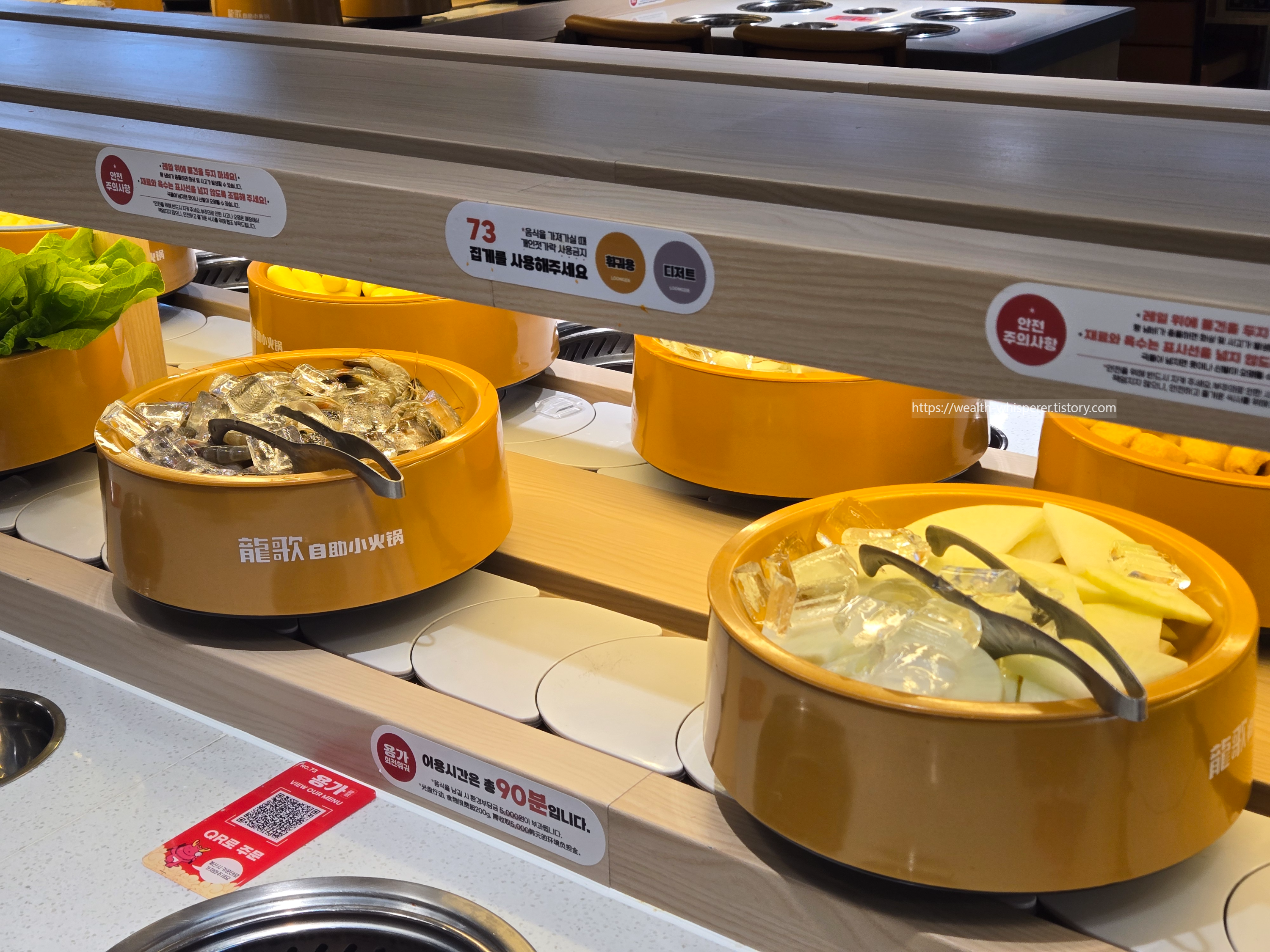 마치 회전 초밥집처럼, 회전 레일 위에는 신선한 야채, 버섯, 해산물, 고기 등 다양한 재료들이 계속 제공됩니다.
