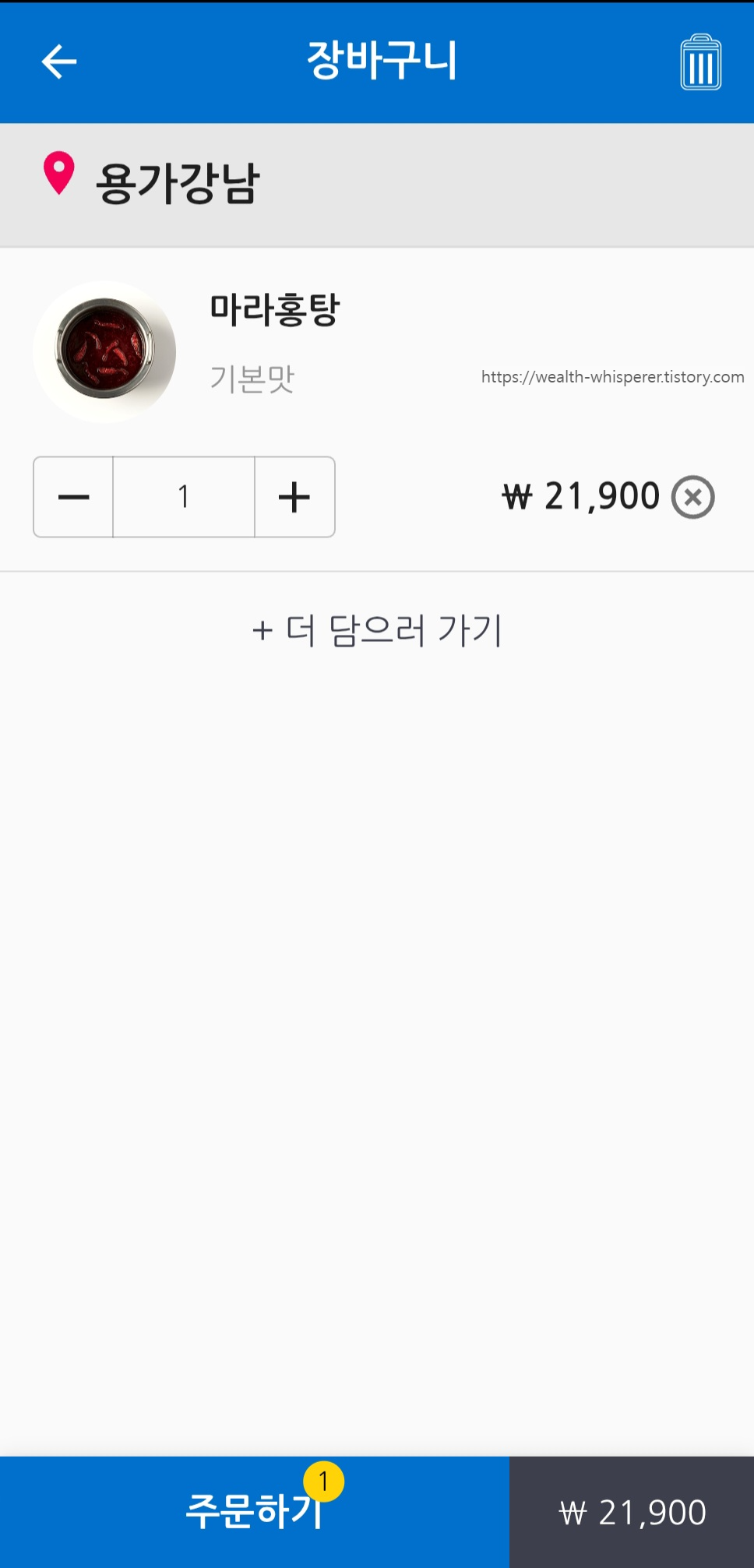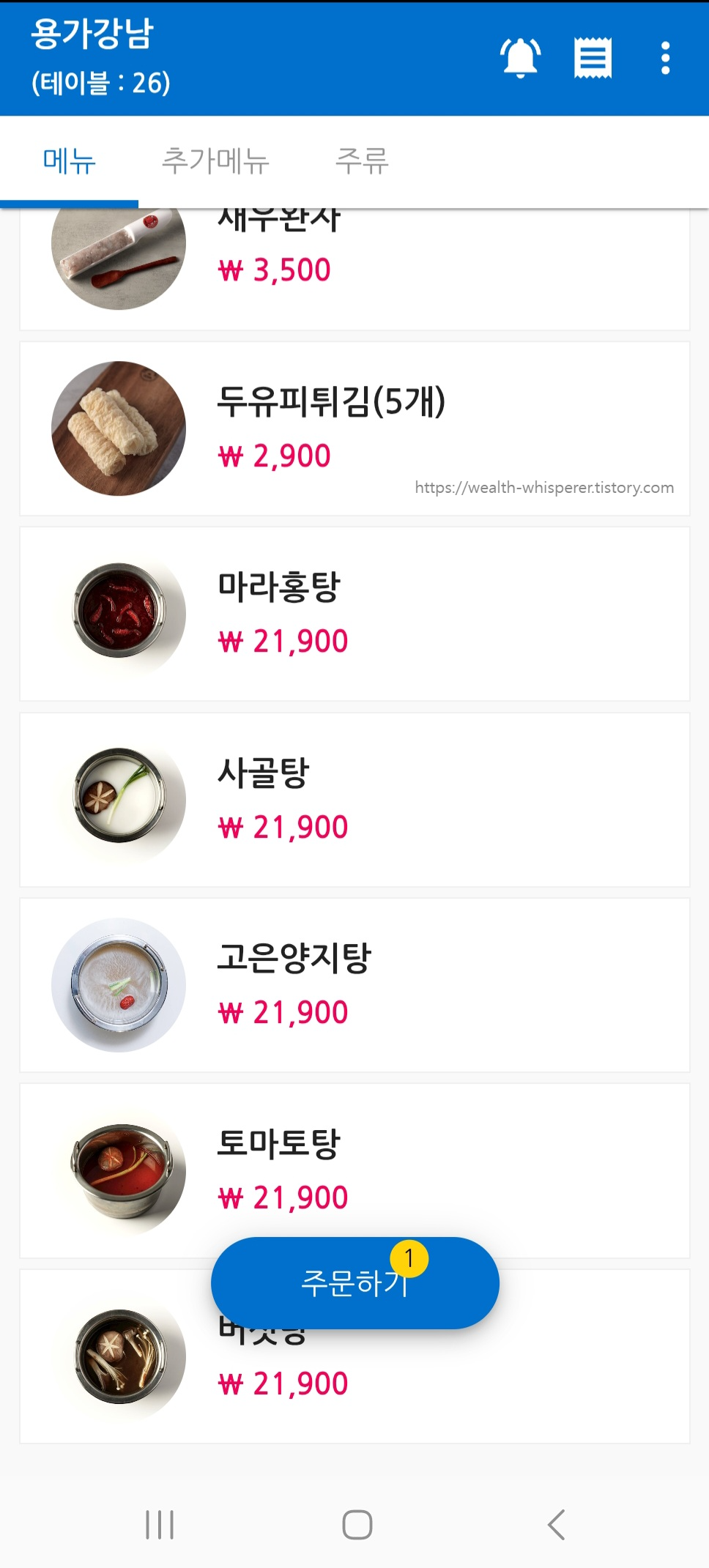> 마라홍탕/사골/양지/버섯탕 등 가격은 21,900원으로 동일했어요.