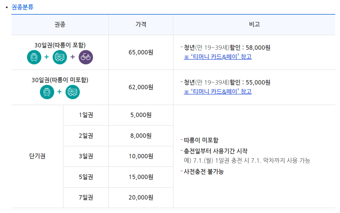 - 이용범위: 서울지역 지하철 + 김포골드라인, 서울시 면허 시내·마을버스, 따릉이(자전거)