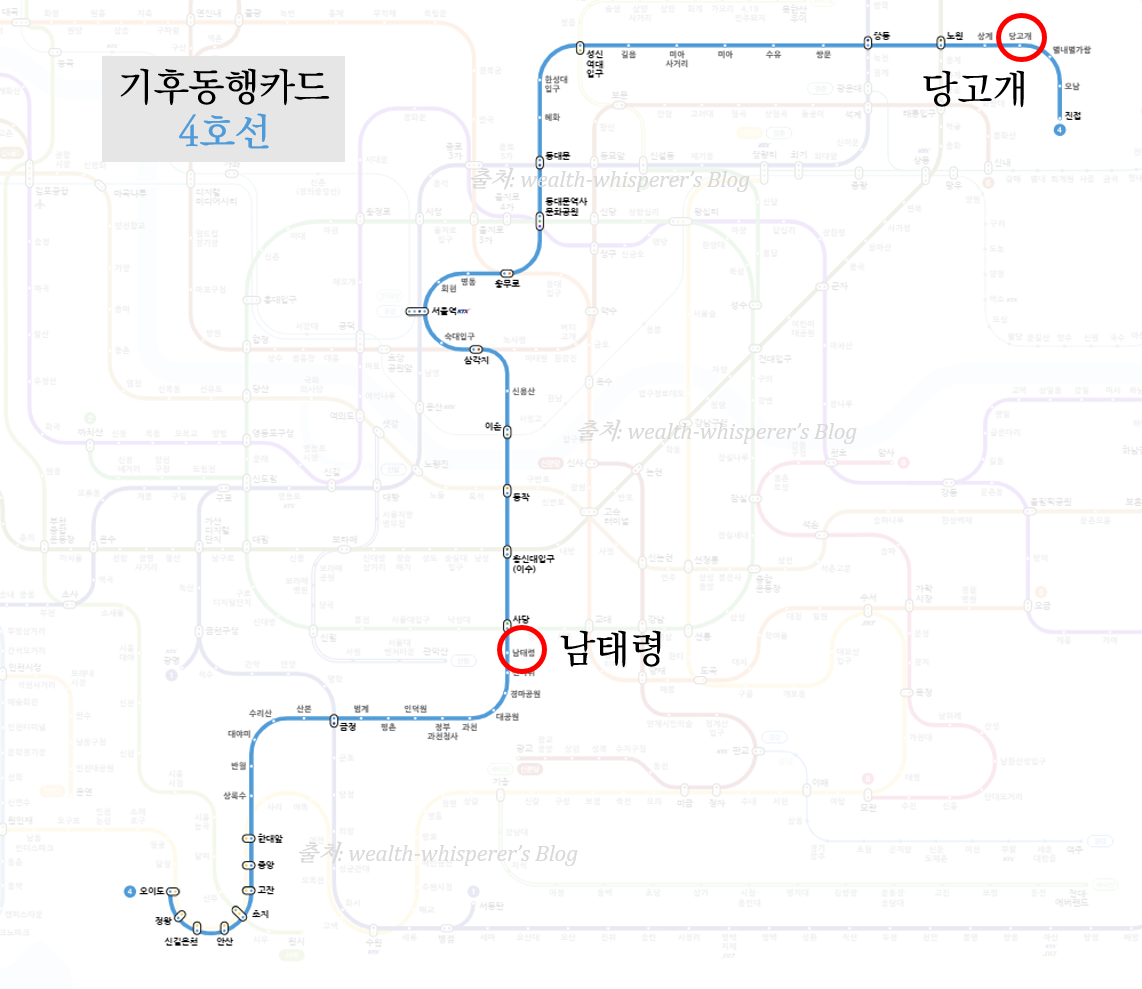 4호선 : 남태령~ 당고개역 진접역 사이(※ '24.11 업데이트: 진접역까지 가능)