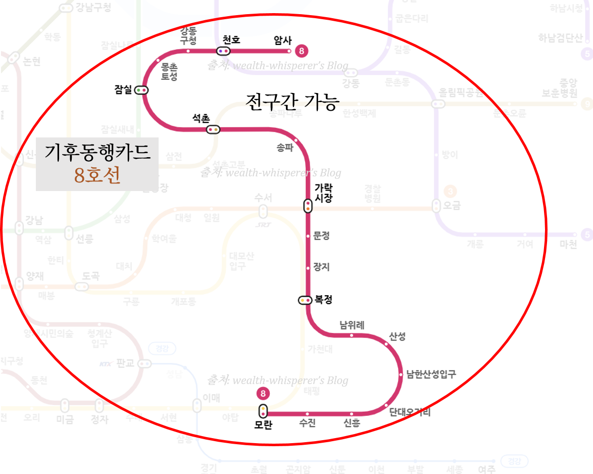 | 8호선: 전구간 ▶ 8호선은 예외로 성남구간까지 모두 사용 가능합니다 즉 모란역, 수진역, 신흥역, 단대오거리역, 남한산성입구역, 산성역, 남위례역 이용 가능합니다! |