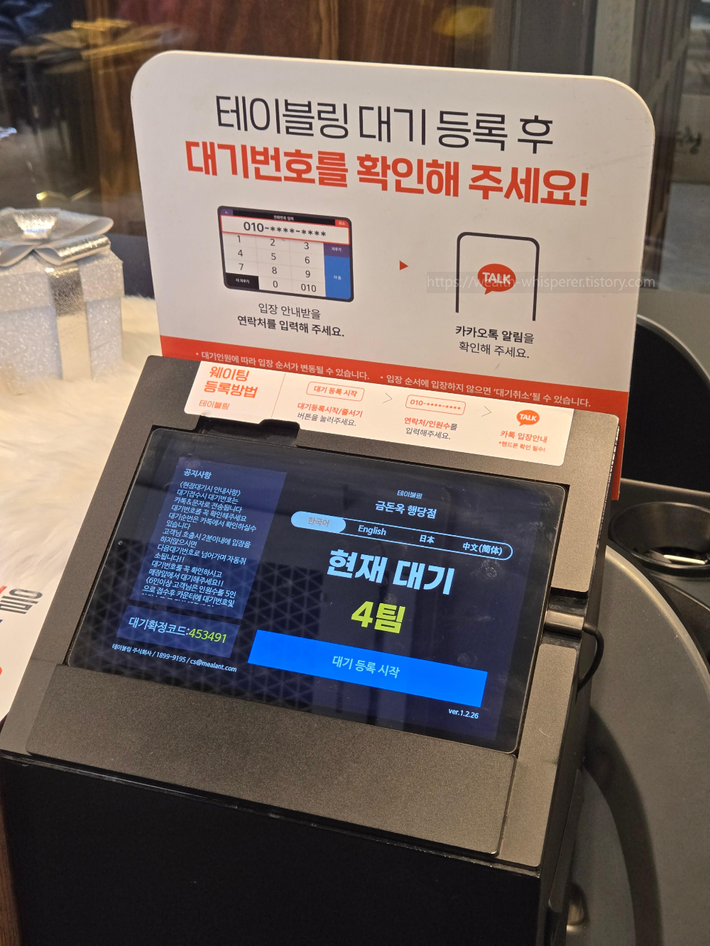 4인 이상 예약 가능(당일X, 0507-1463-9092), 미예약시 테이블링 이용