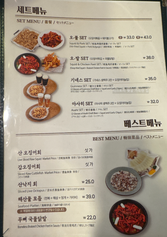 ➡️대표메뉴: 오·불(오징어 + 돼지불고기) 세트, 산 오징어 회, 오징어 튀김