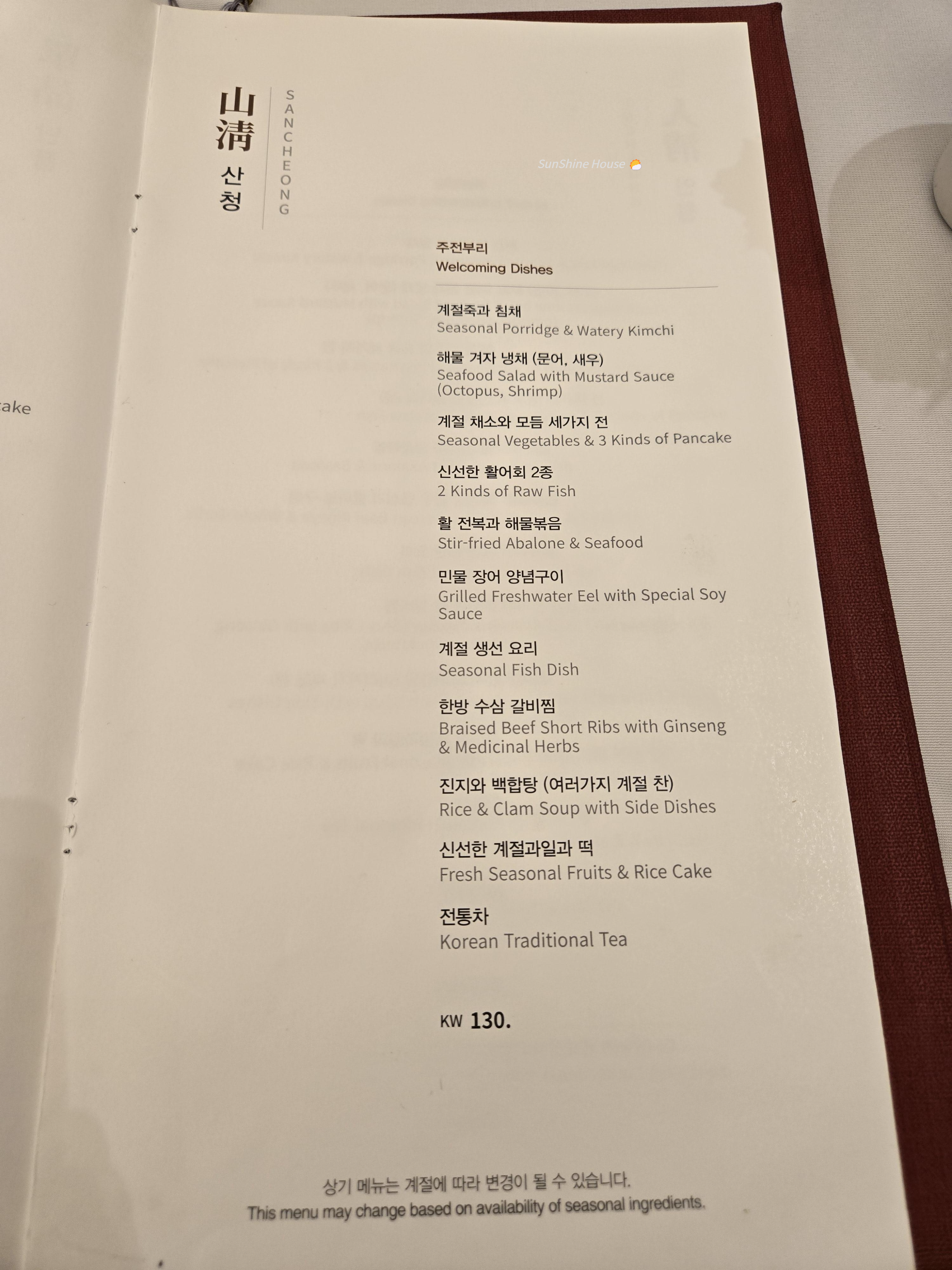 평일 저녁과 주말, 공휴일은 수청(水淸) 코스 이상부터 주문이 가능하다고 합니다.