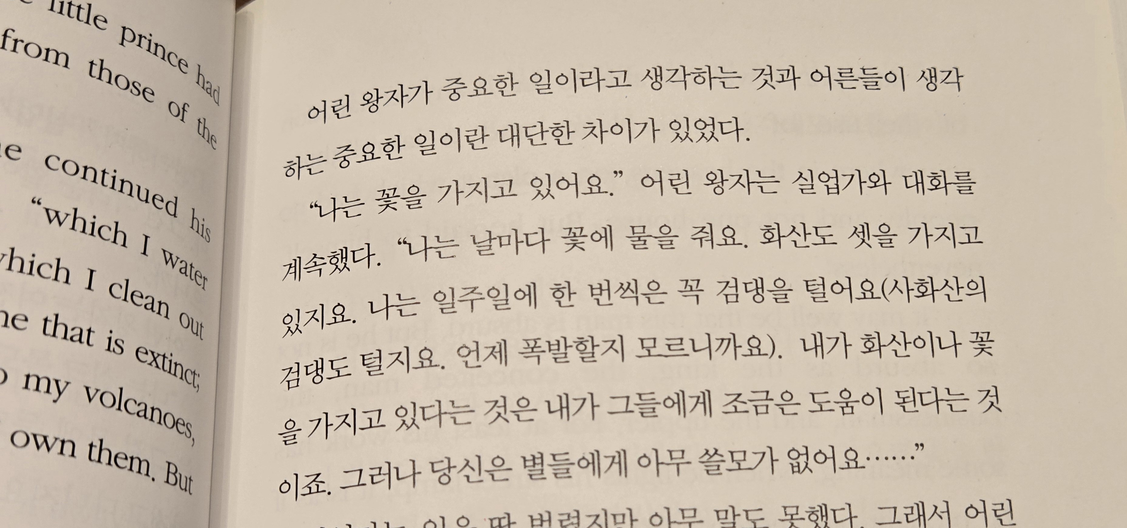 바오밥 이야기를 지나 325번부터 330번까지 이어지는 혹성별 이야기는 권위에 집착하는 왕, 찬미만 바라는 허영심 많은 사람, 술을 마시는 이유조차 잊은 주정뱅이, 소유에 집착하는 실업가, 명확한 의미 없이 반복되는 일상을 사는 사람, 가본적 없는 기록을 하는 지리학자를 통해 어른들의 모순과 공허함을 비추다 못해 뼈를 맞은듯 아픕니다. 아이처럼 단순하고 순수한 질문 하나에 흔들리는 그들의 모습은, 착잡하게 닮아있는 어른의 나 자신의 모습을 보는듯해서 많이 울적했습니다.