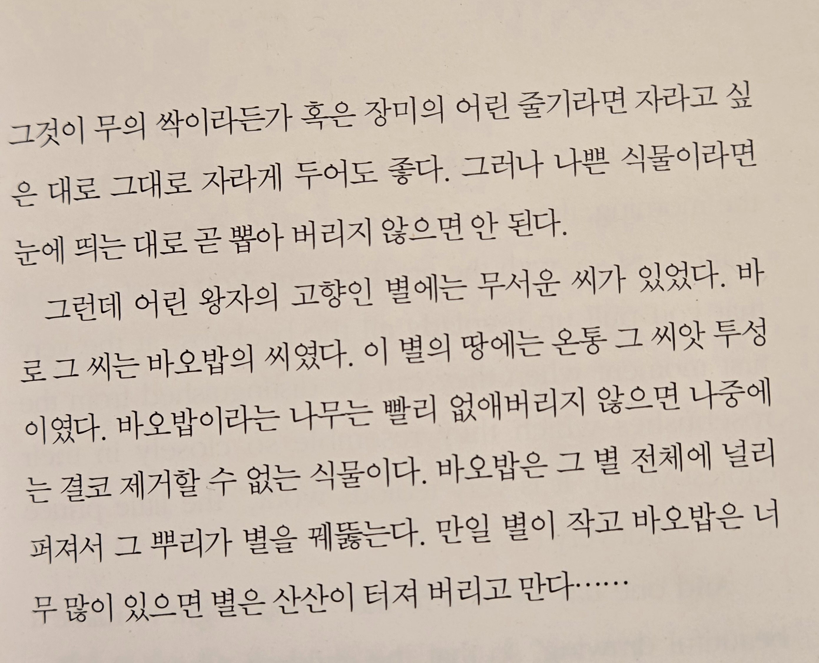 저의 바오밥은 완벽주의입니다. 완벽하고 싶어서 잘 도전을 못해요. 그리고 뭔가 잘 안되면 쉽게 포기하곤 합니다. 어린왕자를 읽으며 저의 바오밥이 올라올때면 나이키 광고를 생각합니다. '그냥해'. 바오밥을 삽으로 계속 퍼냅니다. 책을 읽고나서 완벽주의로 게으름피우고 있는 저를 보며 외칩니다. 그거 바오밥이야! 얼른 퍼내! 완벽주의라는 이름의 방치까지 퍼내!