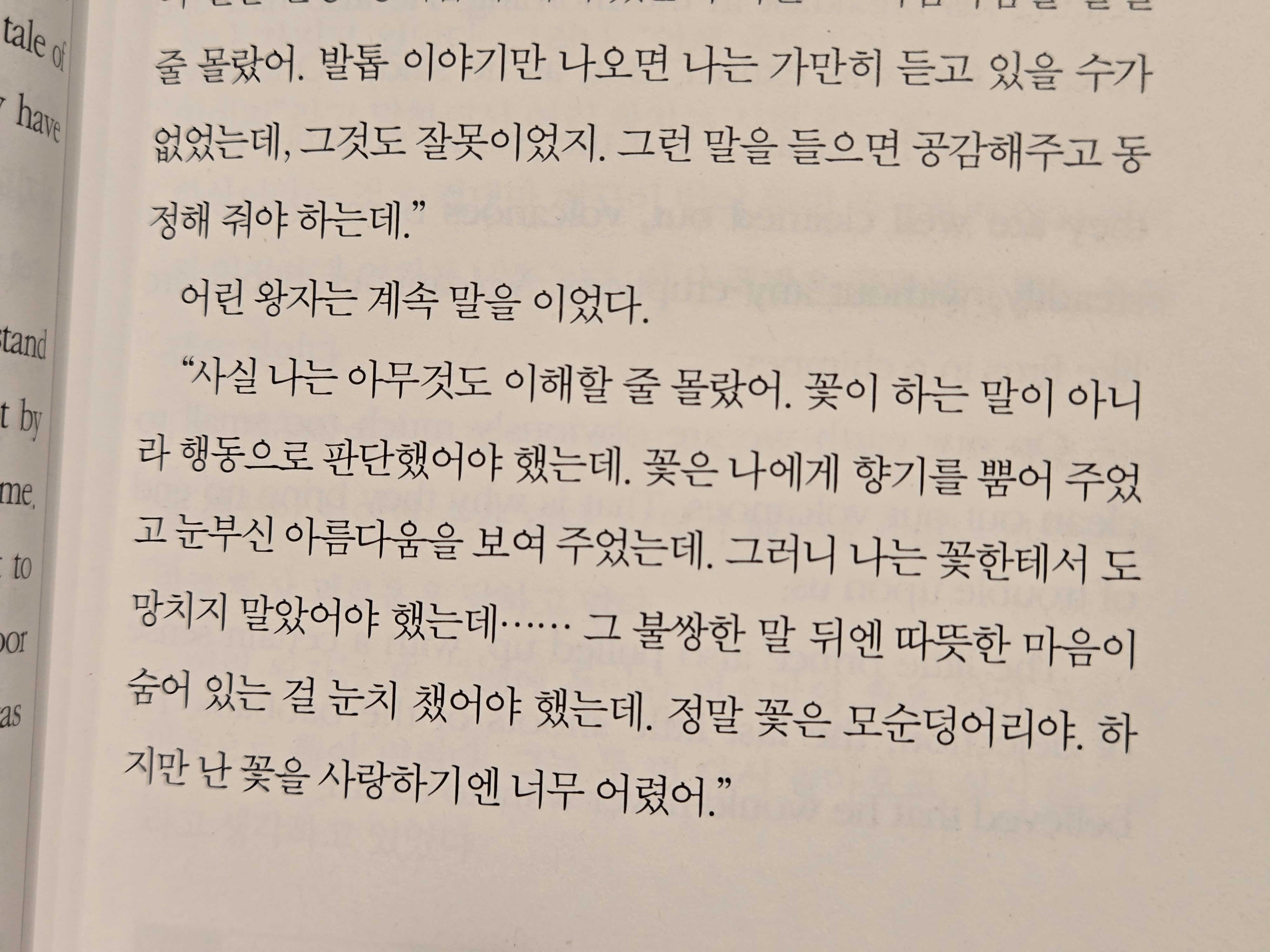 이 책의 백미인 장미와 여우씬은 인연과 책임, 그리고 소중함의 의미를 되새기게 합니다. "말보다 중요한 건 함께한 시간"이라는 메시지는, 유의미한 ‘관계’란 단지 오래 알고 지낸 사이가 아니라 함께 시간을 나눈 사이임을 알려줘요. 의미 없는 많음보다, 깊이 있는 하나의 관계가 더 소중하다는 메세지가 마음에 남습니다. 물을 길어 나르는 장면에서는 아무 말 없이 나란히 걷던 어린 시절의 나와 마주한 듯한 느낌을 받았습니다. 말보다 마음이 통하던 순간들, 설명 없이도 충분했던 시간들이 떠올랐습니다.