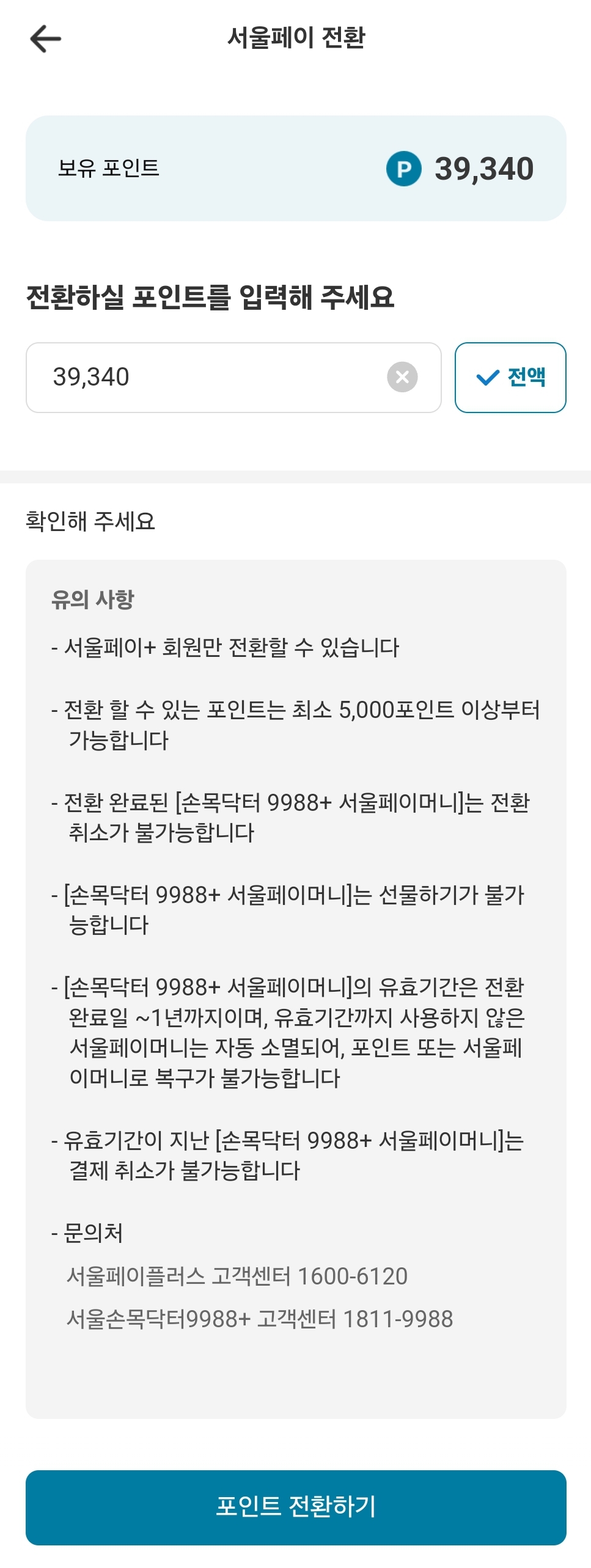 손목닥터 9988+ 포인트는 5천 포인트 이상만 되면 서울페이머니로 전환이 가능합니다.
