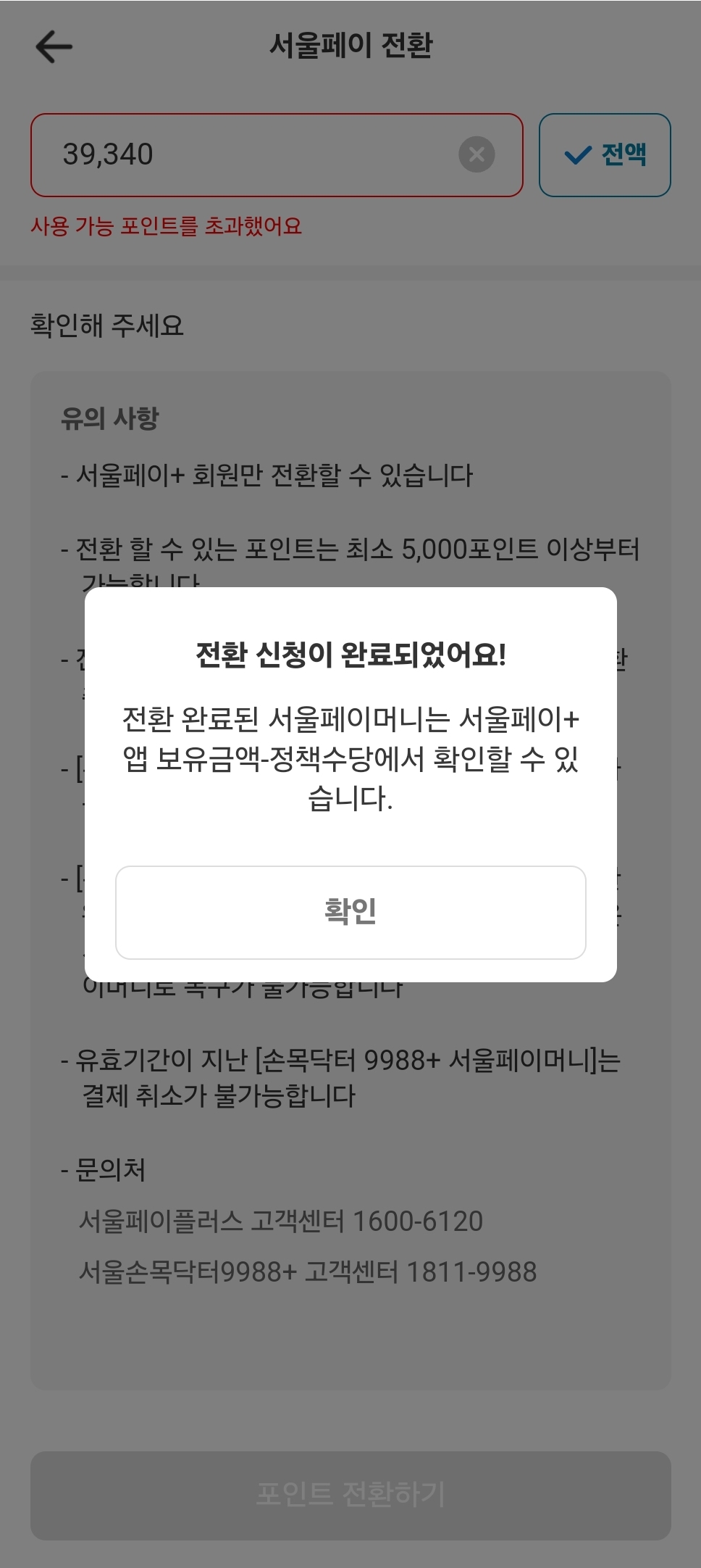 손목닥터 9988+ 포인트는 5천 포인트 이상만 되면 서울페이머니로 전환이 가능합니다.