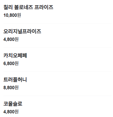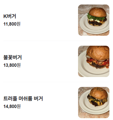 제가 주문한 메뉴는 불꽃버거, 트러플 머쉬룸 버거, 카치오 페페(감자튀김)입니다.