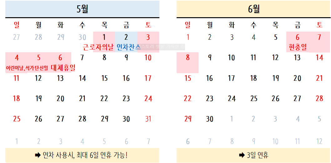 - 2일 연차사용시 최대 6일 연휴 누리기 가능