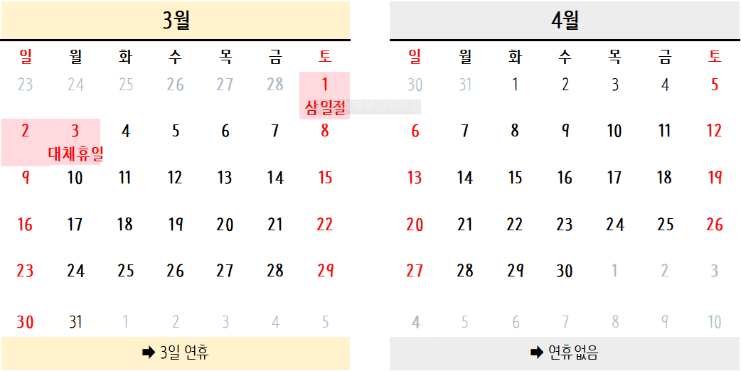 ➡️ 3월 1일(토) : 삼일절 → 3월 3일(월) 대체휴일