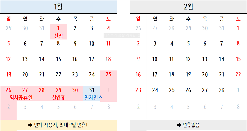 파란색 달력 : 연차찬스시 최대 연휴 가능 달 → 1월(31일), 5월(2일), 10월(10일), 12월(26일)
